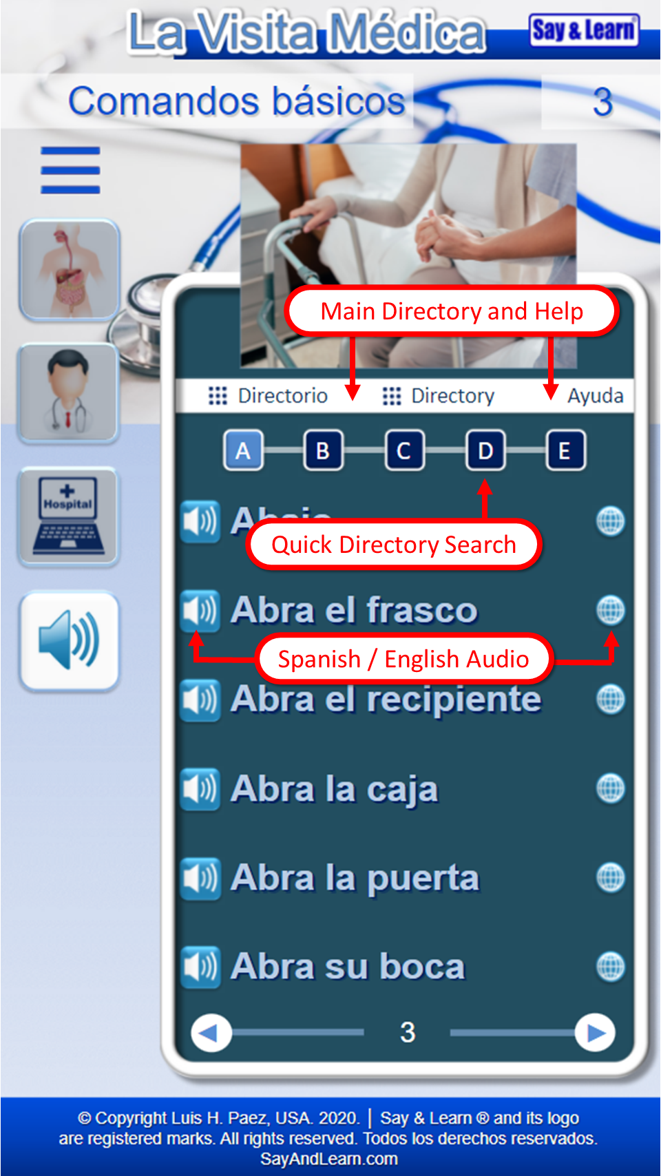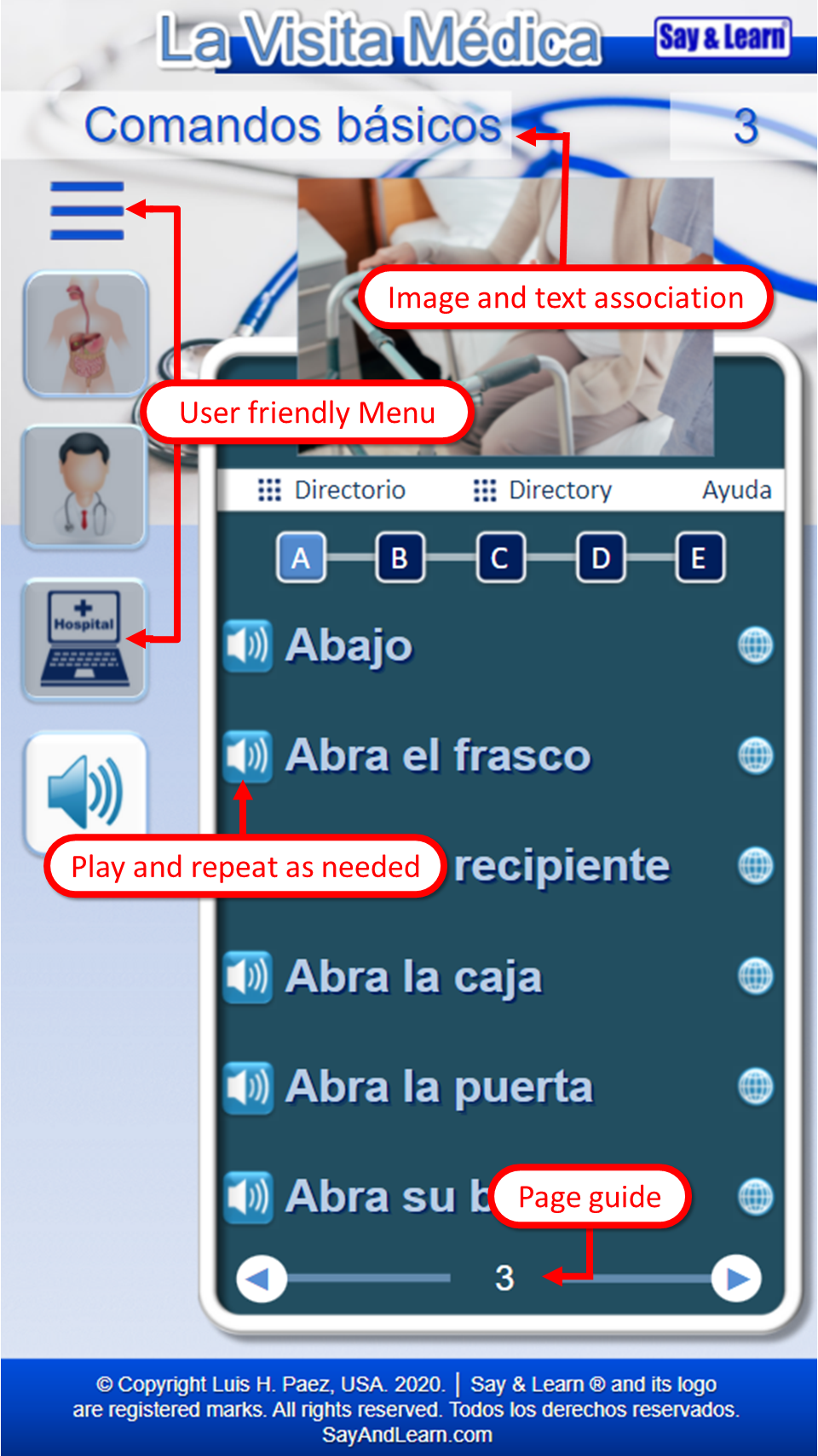 La Visita Médica - The Medical Visit™ is a Say & Learn ®  collection of bilingual (English/Spanish) interactive eBooks, quizzes and audio word search puzzles that allows user to quickly learn and practice words, phrases and expressions of frequent use during daily work at medical offices, laboratories and health care centers.