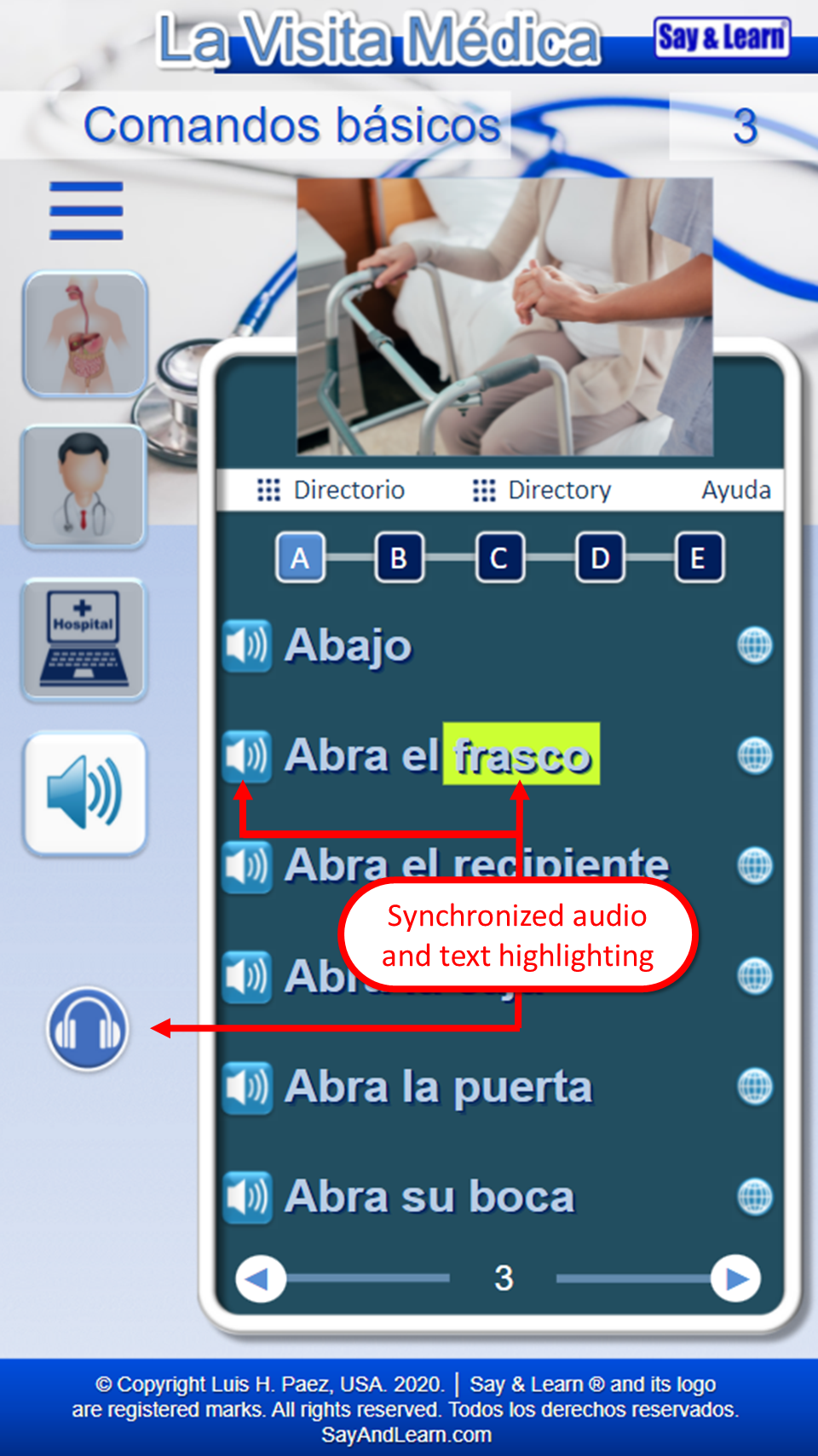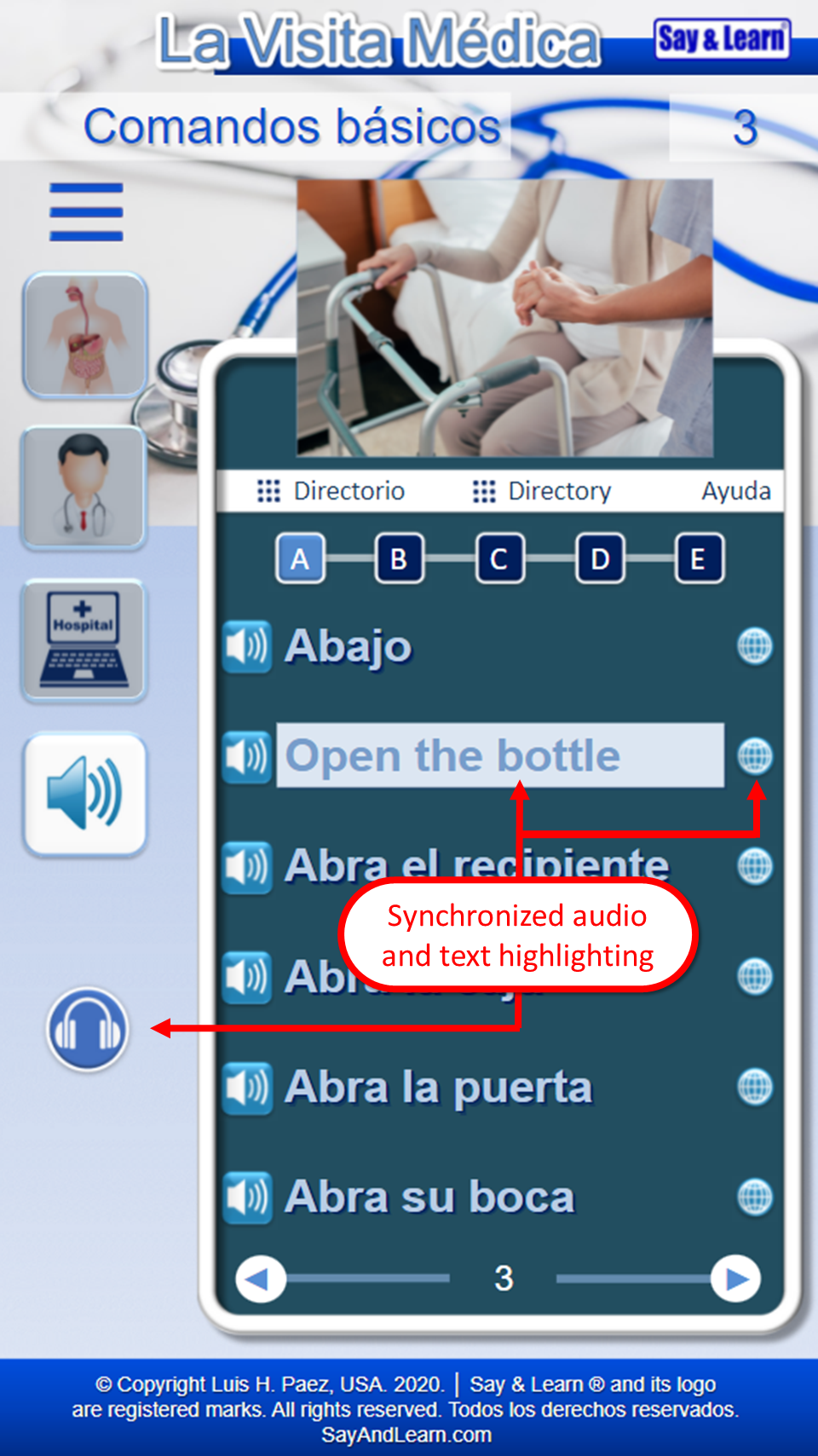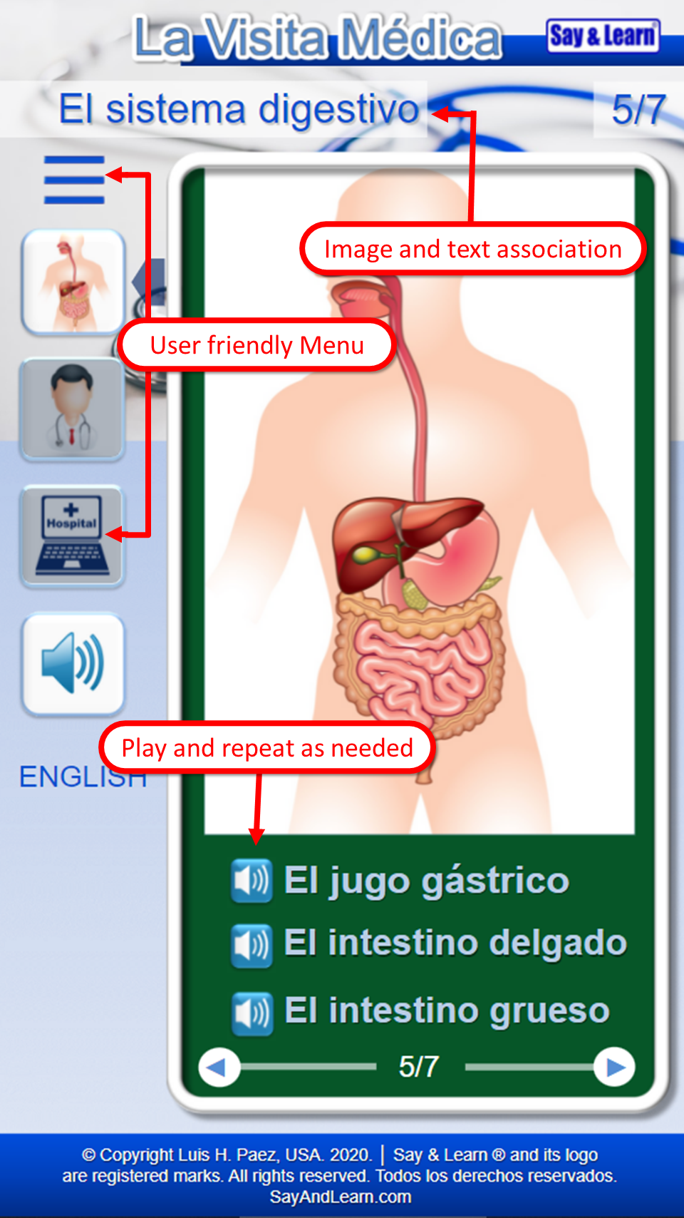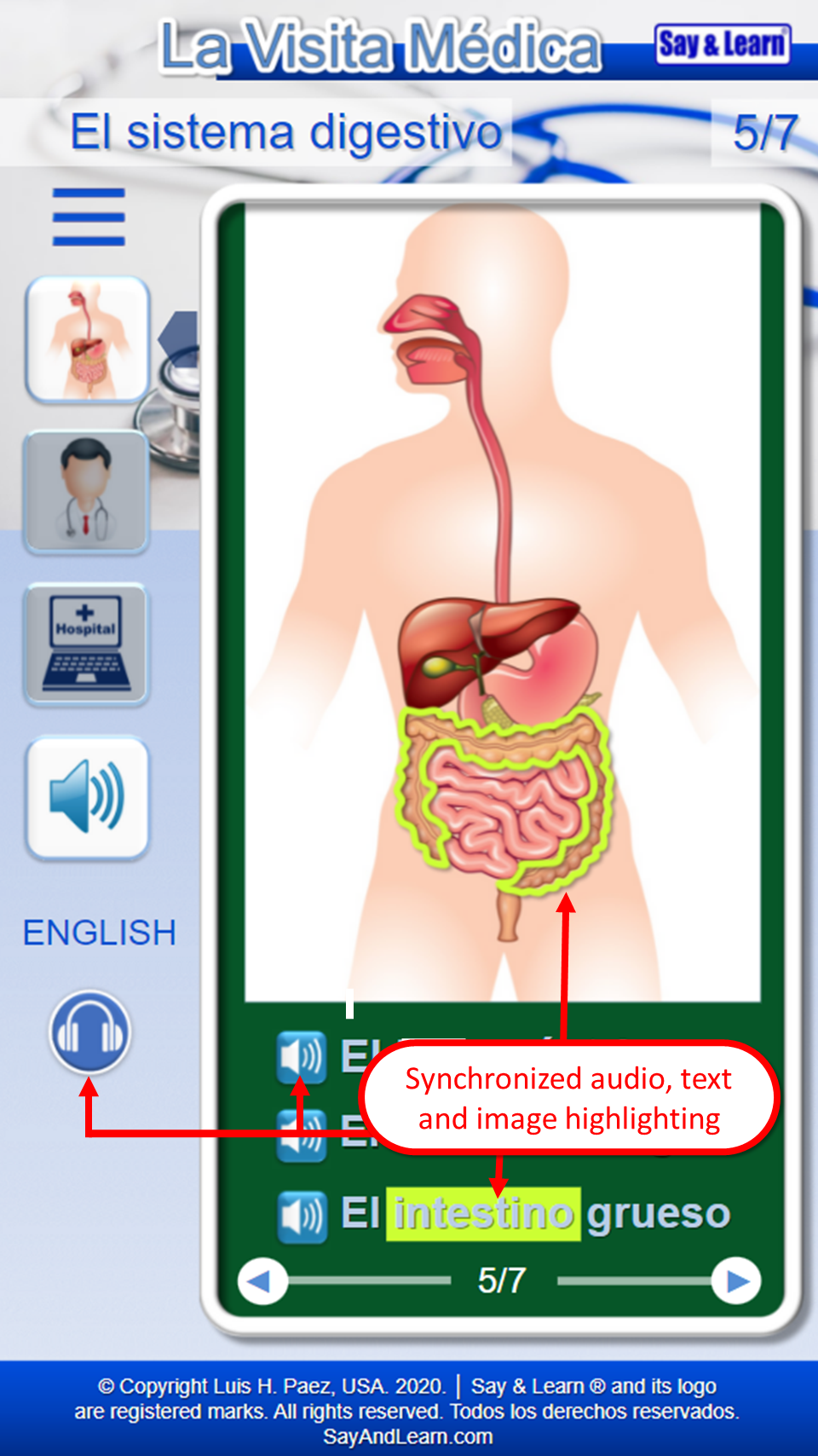 Based on proven methods of cognitive association of images, text reading and word repetition, La Visita Médica - The Medical Visit™  contains hundreds of animated audio files synchronized with words, phrases and image highlighting that you can play and repeat many times as you need. This is a totally bilingual collection of eBooks where you can just click or tap on "ENGLISH" at any page and all the content (text, graphics, animations and audio) will instantly change to English. If you want to go back to Spanish content, you just click or tap once on "ESPAÑOL".