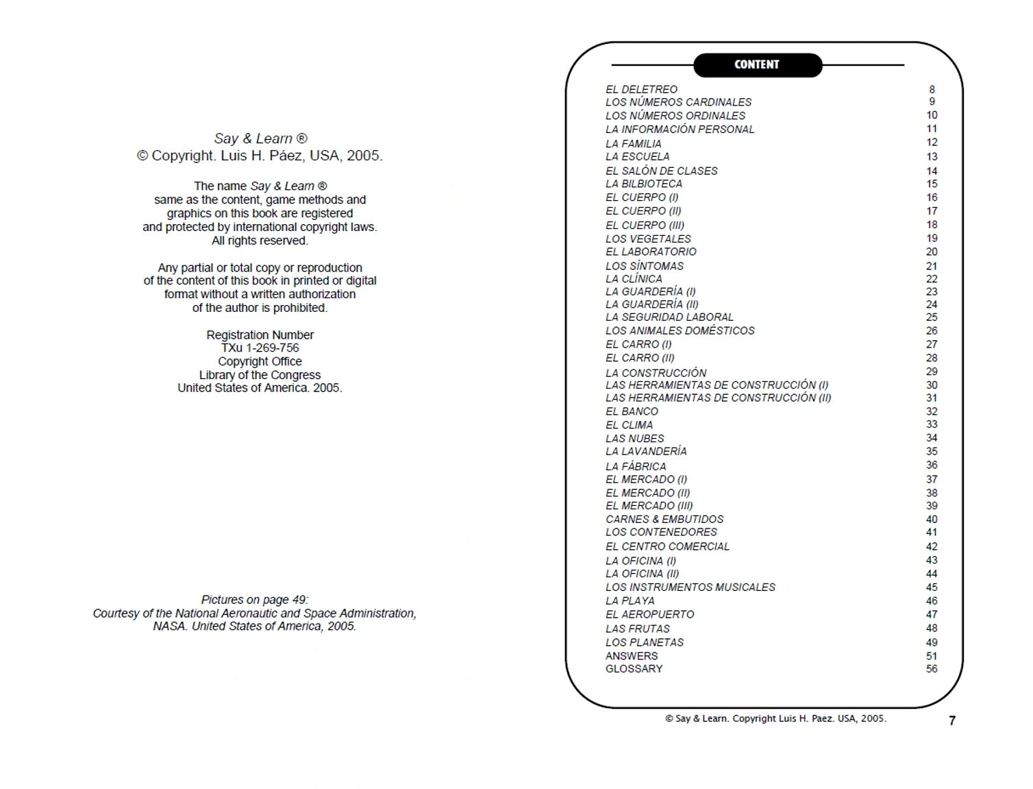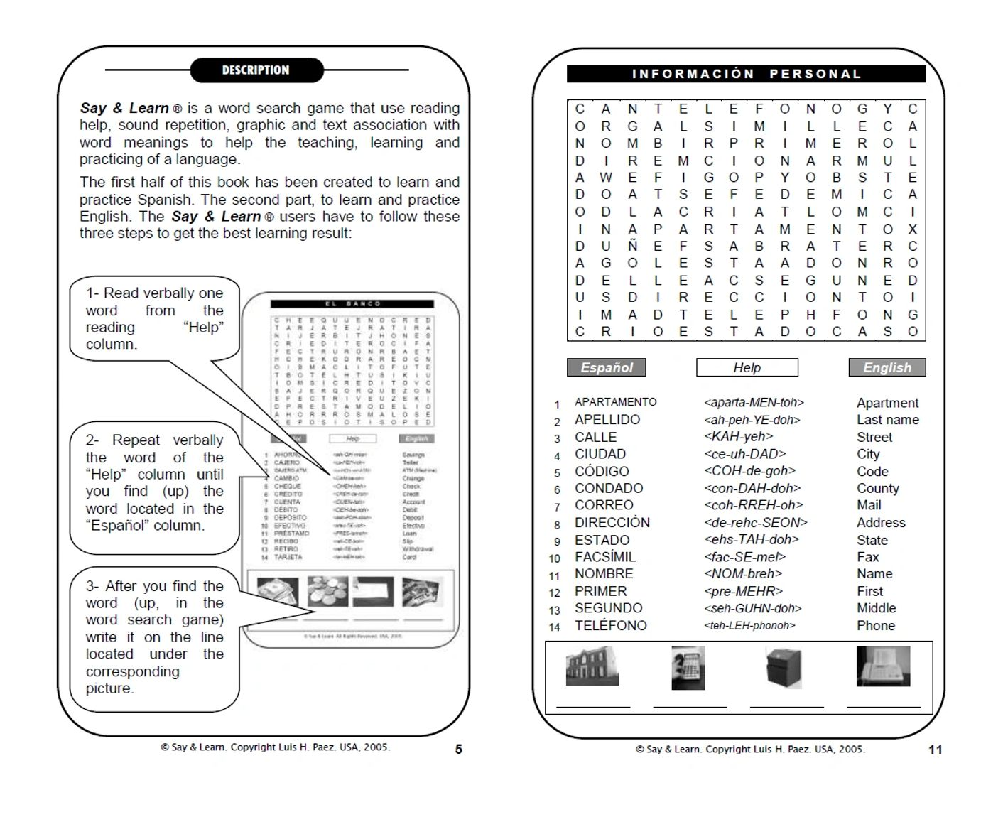 The first half of this flip book is in English, for Spanish learning. The second part is in Spanish, for English learning. Therefore, Say & Learn ® Word search puzzles with reading help can also be considered as a dual resource for students and teachers of Spanish or English.